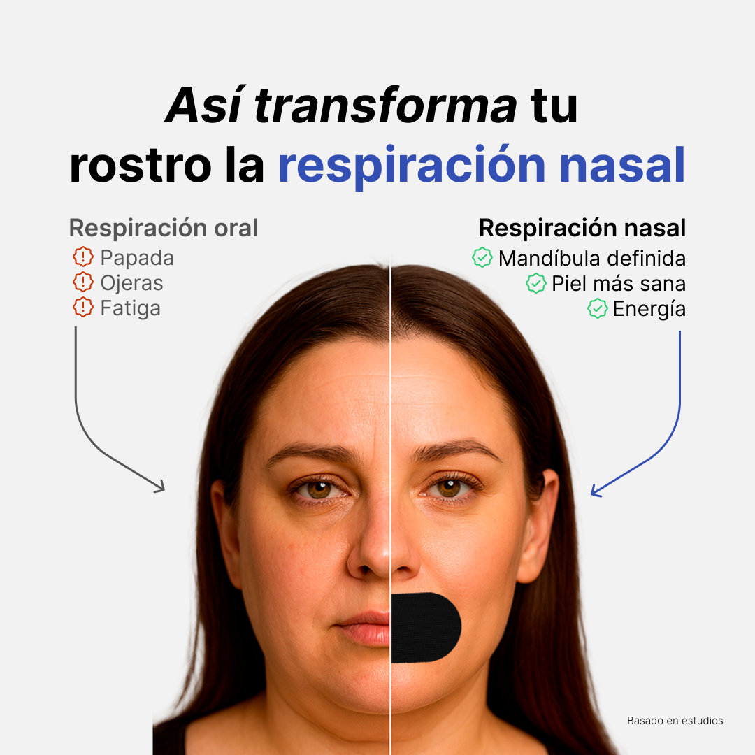 Al sellar tus labios, aseguras la respiración nasal. El aire se calienta, filtra y aumenta la oxigenación hasta un 40%.
